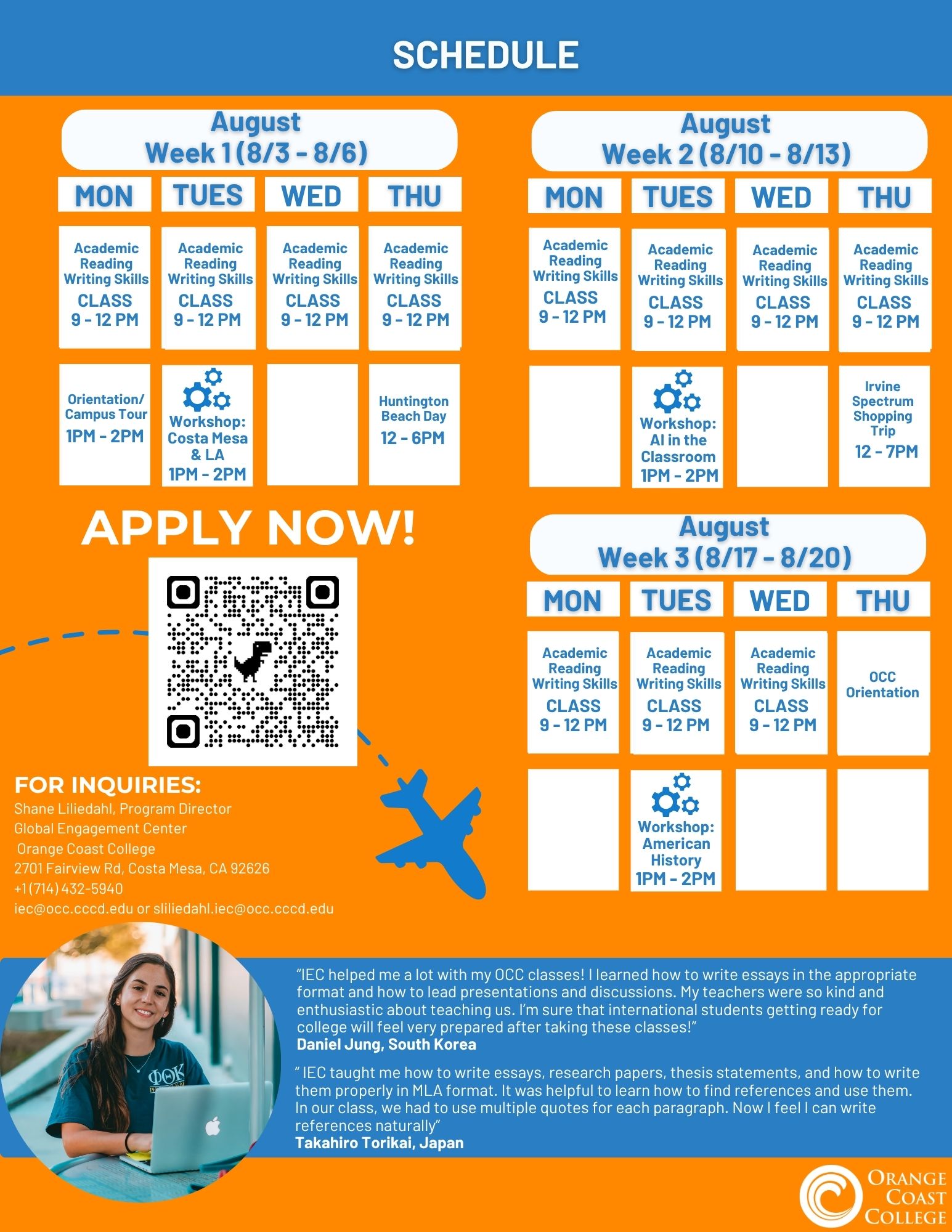 Orange Coast College is partnering with the International Education Center intensive English program to create IEC@OCC. You can come to OCC and learn English before starting college! Click the logo below full details and information: